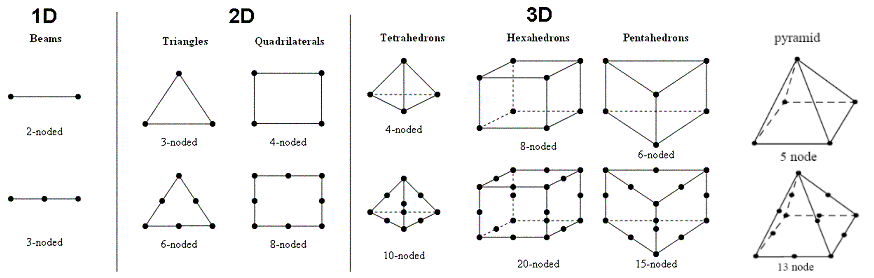 Een richtsnoer voor het bepalen van een elementtype: mesh een constructie zoveel mogelijk volgens zijn eigen opzet, bijv. een plaat met plaatelementen etc. Klik hier om te lezen waarop je de keuze voor 1D (lengte), 2D (gebied) of 3D (volume) elementen kunt baseren. In dit document vind je een handig overzicht van de elementtypes, kwaliteit van elementen en het aantal benodigde elementen. Interpolatiefuncties ofwel ‘shape functions’ bepalen hoe de spanningen binnen het element worden benaderd. Bij het gebruik van een eindige elementen programma worden de shape functions vastgelegd bij de keuze van het elementtype. Zoals je in onderstaande afbeelding kunt zien bepaald het aantal nodes in een element de orde van de shape functions (eerste orde of tweede orde).