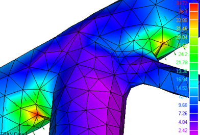 Geen zorgen, FEA software neemt dit proces van verlengen en verplaatsingen met elkaar in verband brengen en de bijbehorende spanningen uitrekenen voor je uit handen. We kunnen met de software heel gemakkelijk de externe belasting verschuiven en zien wat dan de effecten zijn op de constructie. Omdat je zodoende allerlei scenario’s en testen kunt los laten op de constructie, omschrijven wij ons werk ook wel als virtueel prototypen of simulation. Je kunt je voorstellen dat uitvoerige simulatietesten, de kosten van fysieke testen aanzienlijk kan drukken.